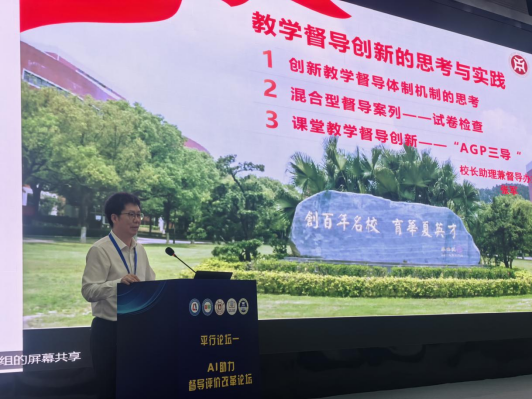本次论坛为期两天,由全国高等教育教学督导协作组、宁波大学、未来学习(北京)信息技术研究院主办,湖南信息学院、诺奖人机交互研究中心承办,采取线上线下相结合的方式举行。会议聚焦“教育强国规划纲要解读”、“数智化助力教学督导工作创新与高质量发展”、“质量保证体系与质量文化建设的理论、路径与实践”三大主题,除主论坛外,开设“AI助力督导评价改革论坛”、“高质量发展与高质量评估、整改论坛”、“民办高校高质量发展论坛”三大平行论坛。教学督导办公室张军主任在平行论坛“AI助力督导评价改革论坛”上作了“教学督导创新的思考与实践”的主旨报告。